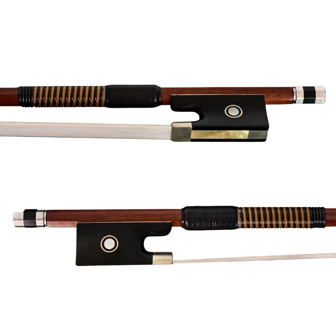 Características: Vara octogonal de palo brasil, talón de ébano con incrustación abalón, diseño ojo de París, grip de cuero, tornillo de tres partes.